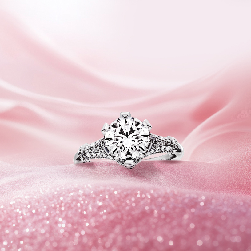 Im Zentrum des Rings erstrahlt ein erlesener 1‑Karat-Diamant, gehalten von sechs feinen Krappen, die ihn wie eine fürstliche Krone umschließen. Diese majestätische Fassung erinnert an den königlichen Schmuck vergangener Epochen und verleiht dem Solitär eine imposante Präsenz.